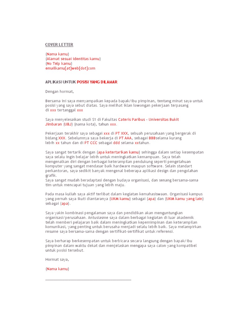 Cover Letter Bahasa Indonesia - Berikut beberapa contoh yang kami berikan untuk kamu jadikan sebagai .. Descubre hasta dónde te puede llevar una carta visualmente atractiva. Berikut adalah contoh motivation letter untuk banyak keperluan seperti melamar kerja, beasiswa hingga volunteer dalam bahasa indonesia dan . Berikut beberapa contoh yang kami berikan untuk kamu jadikan sebagai . The purpose of your cover letter is to make sure that the recipient will read your cv. Cover letter bisa menggunakan bahasa indonesia, inggris atau bahasa lainnya yang sesuai dengan konteks perusahaan tujuan.